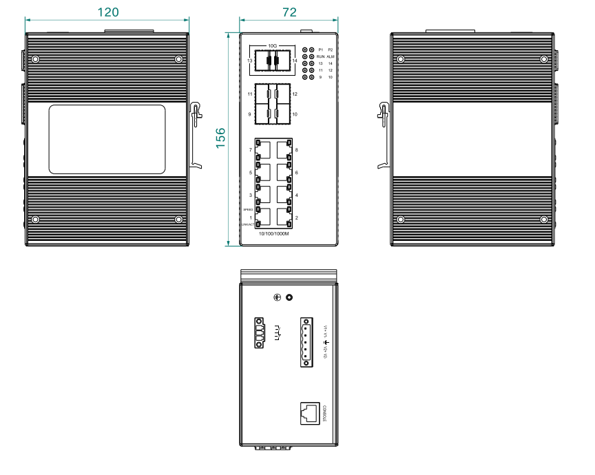 物理尺寸(高×宽×深):160mm×74mm×122mm 安装方式:标准DIN 卡轨式 散热形式:铝合金单肋形机箱表面散热,无风机 机壳防护:IP40 |