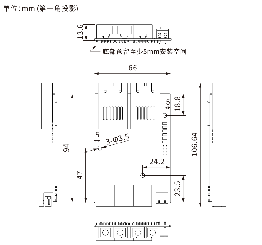 安装方式:嵌入式安装 散热方式:自然冷却,无风扇 外形尺寸:94×66×13.6(mm)(不含连接器尺寸) |